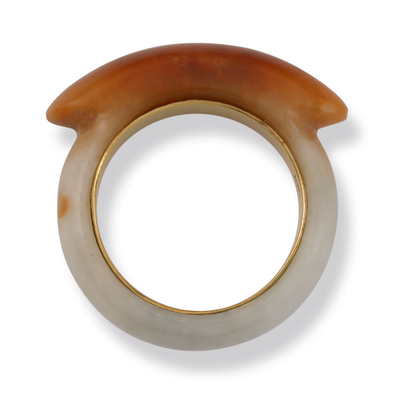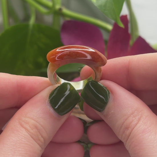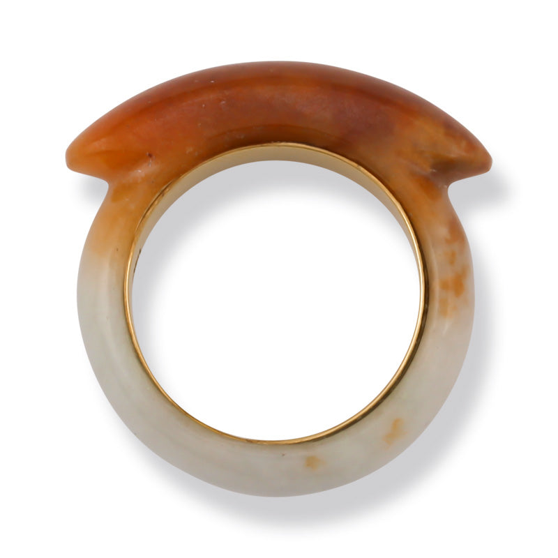 Continuous red jadeite jade estate saddle ring with 14K yellow gold inner lining. Finger size 6.5. Durable enough for everyday wear! Natural, untreated, Type A jadeite jade. Guaranteed! Includes Certifiate of Authenticity & Gift Wrap!