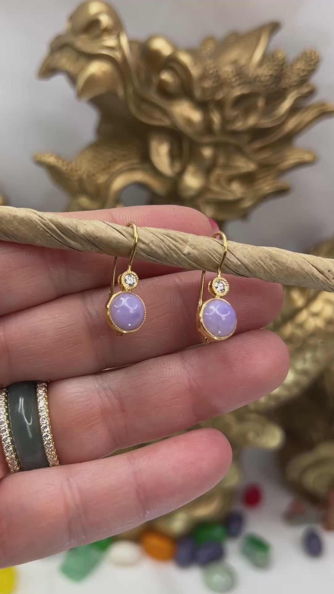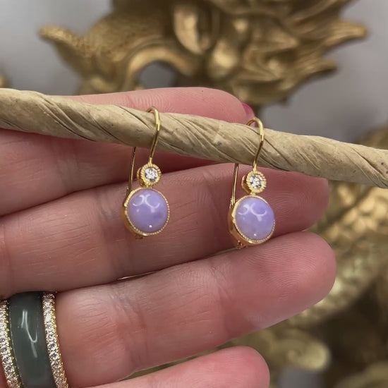 These authentic jade earrings for women have natural lavender jade color, come on 18K yellow gold leverbacks.
