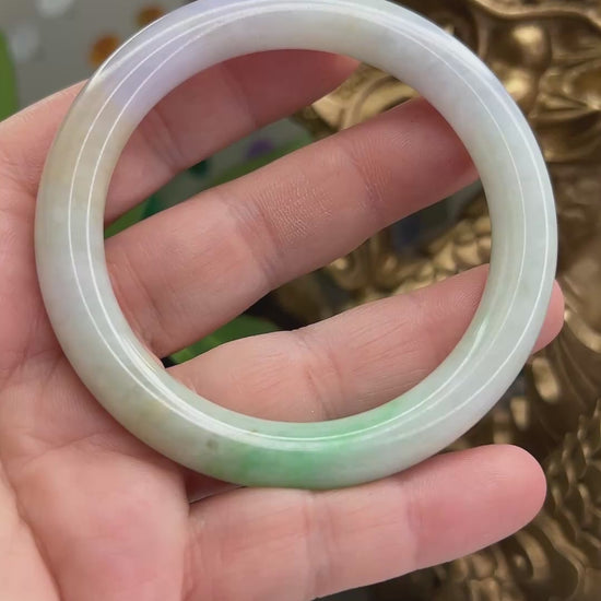 Discover the stunning tricolor jadeite jade bangle featuring shades of green, lavender, with hints of apple green and yellow. This unique cylindrical design showcases vibrant natural hues, making it a captivating addition to any collection.