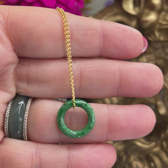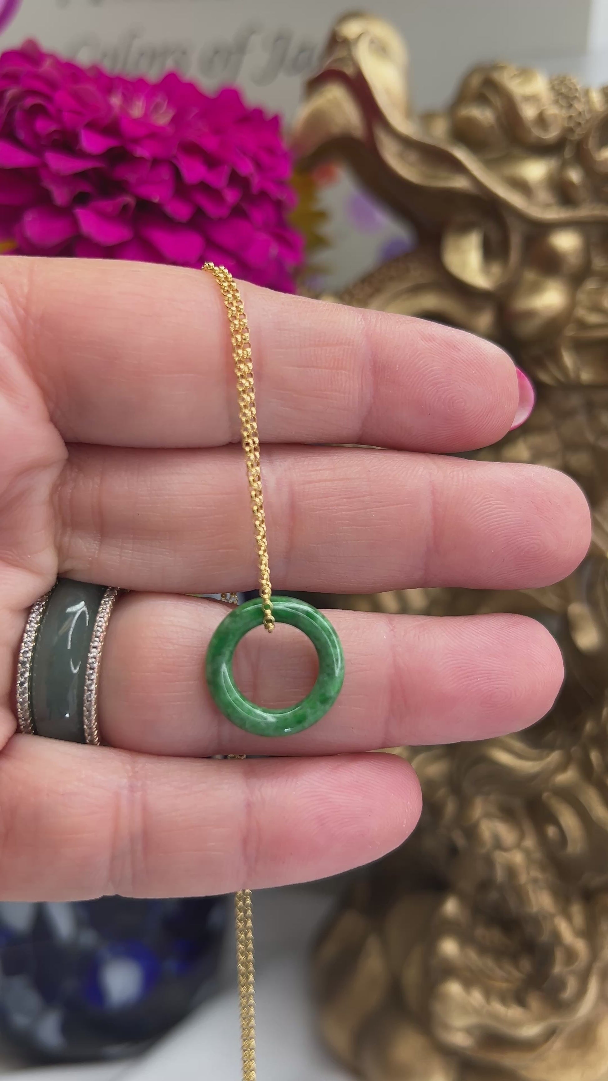 Rich green tones of jadeite jade surround this exquisite circle pendant, suspended from an 18-inch yellow gold chain.