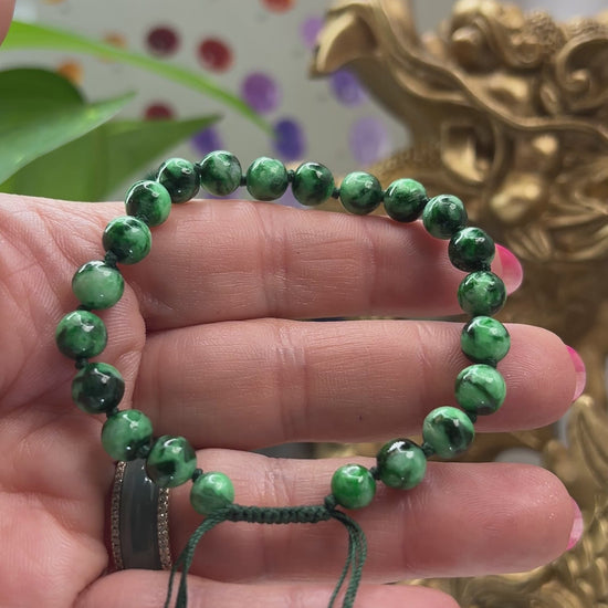 Featuring twenty-two 6.6mm medium green jadeite jade beads with distinctive dark green spots, this classic Mason-Kay bracelet offers both style and functionality. The adjustable pull cord provides a comfortable fit for medium to large wrists, making it a perfect choice for daily wear.