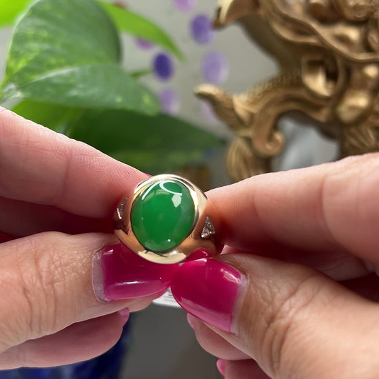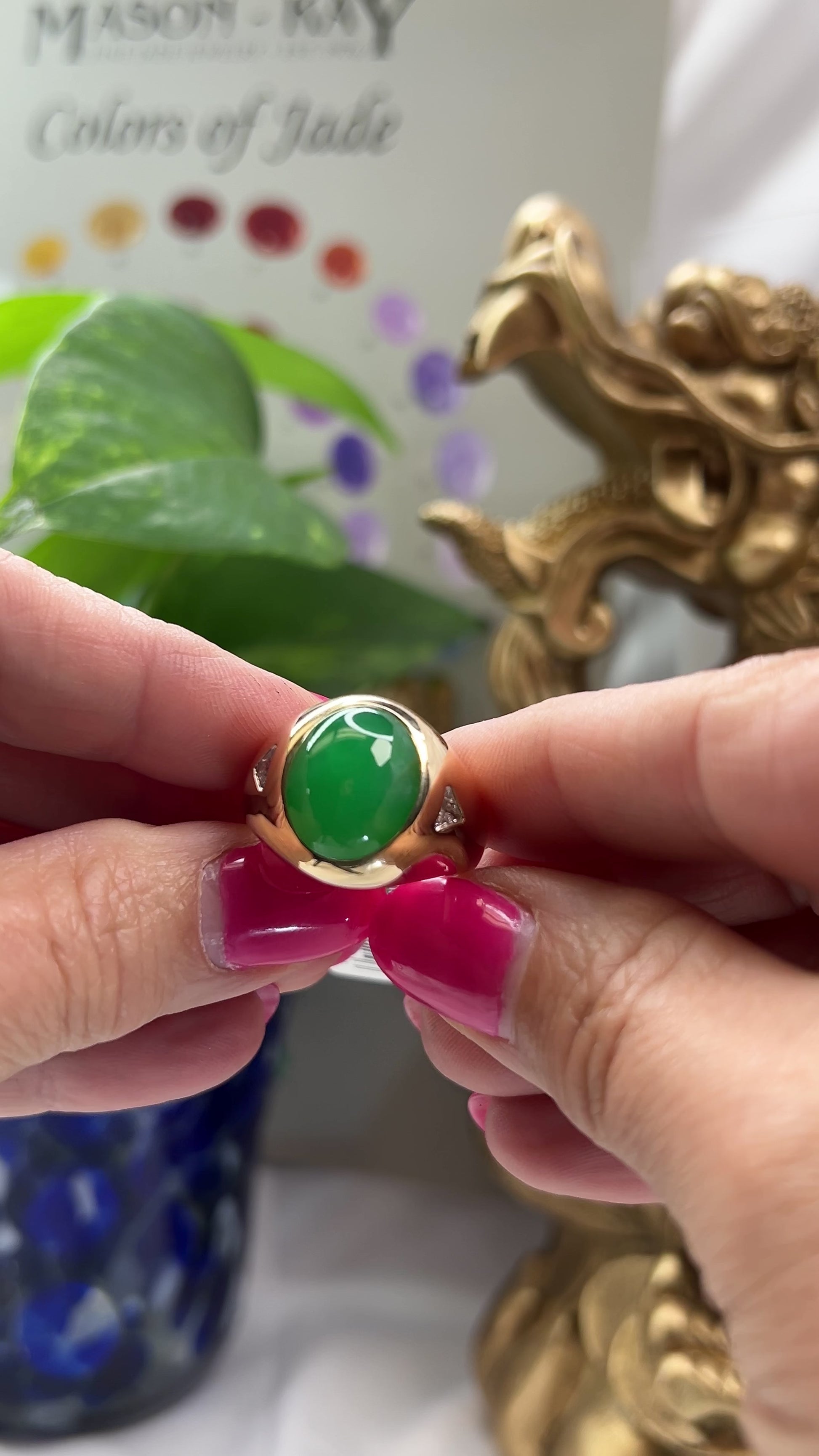 Featuring a vivid, bright apple green oval jadeite jade as the centerpiece, this ring is enhanced by two natural trilliant-cut diamond accents on the shoulders. Crafted in 14K yellow gold with a gypsy-style band, it embodies a timeless design that remains highly popular among men.