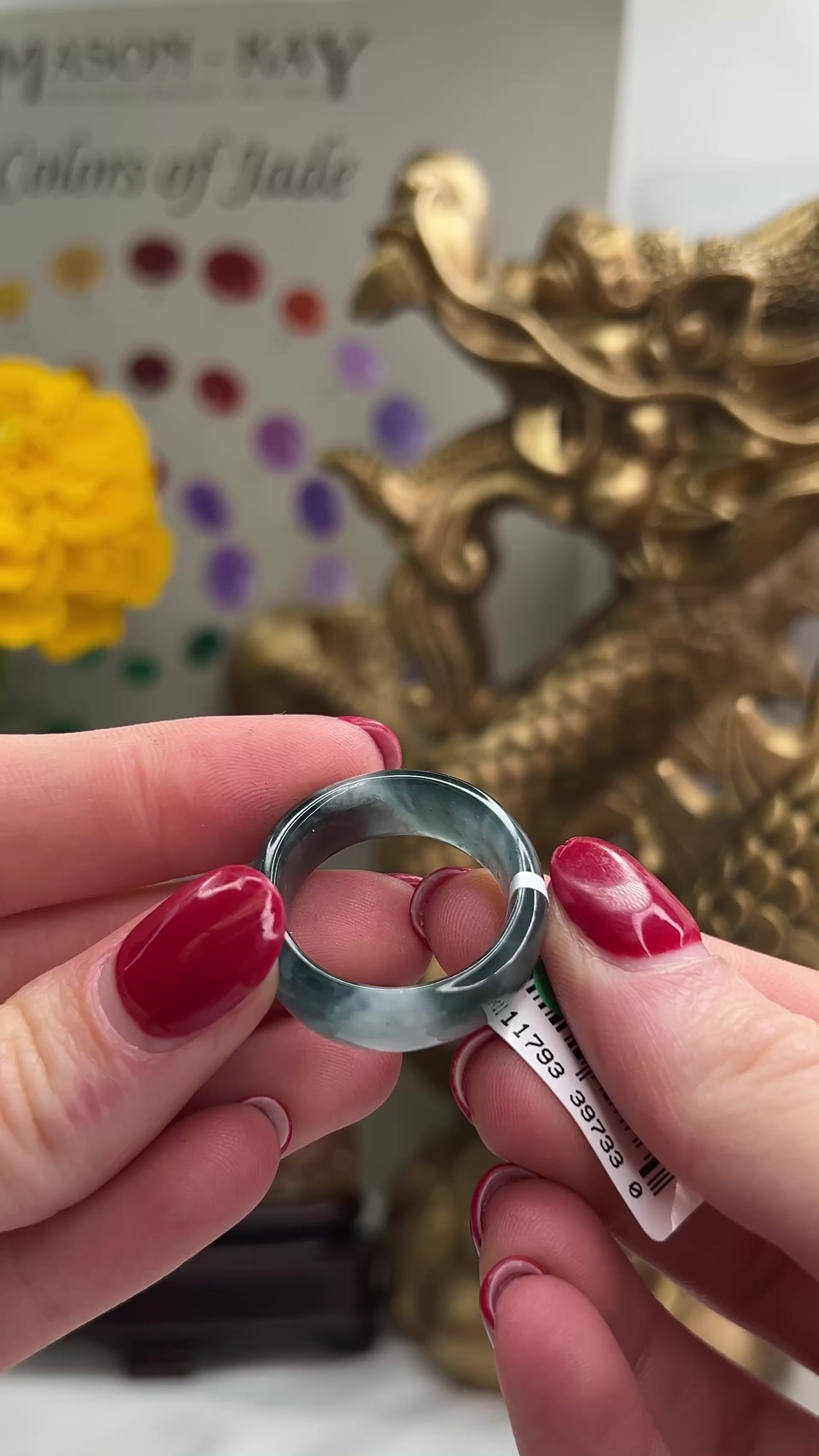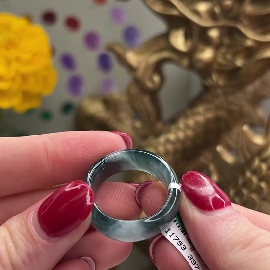 Guatemalan blue-green translucent jadeite jade solid band for men or women. Due to the stone's translucency, it's appearance may shift depending on lighting conditions. Highly translucent jade rings are tougher (more resistant to breaking) but should still be handled with care. Do not drop on cement or tile.