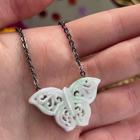 This stunning soft green jadeite jade butterfly pendant is showcased on an 18-inch oxidized steel chain. The butterfly, a timeless emblem of love, makes this piece both beautiful and meaningful.