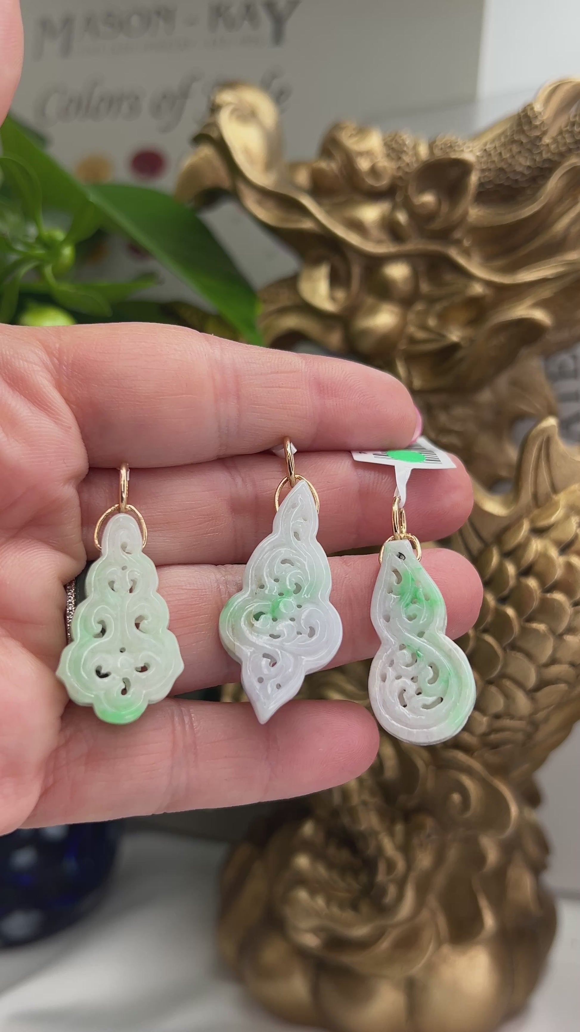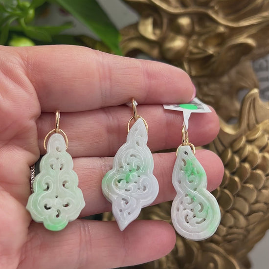This green jadeite jade pendants are adorned with finely carved scroll work and finished with a yellow gold oval loop bail. Its soothing green color and exquisite craftsmanship make it an essential piece. Designed to be reversible and versatile, it’s perfect for daily wear and a meaningful jade gift for any celebration.