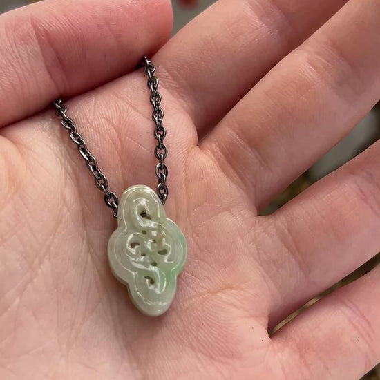 This necklace features a delicately carved soft green and white jadeite jade slide with a hollow, free-form design, paired with an oxidized steel chain. Its unique reversible style allows you to wear it vertically or horizontally, offering versatile elegance. Perfect for adding a touch of natural beauty to your everyday look.