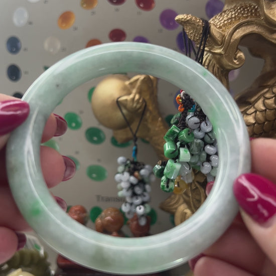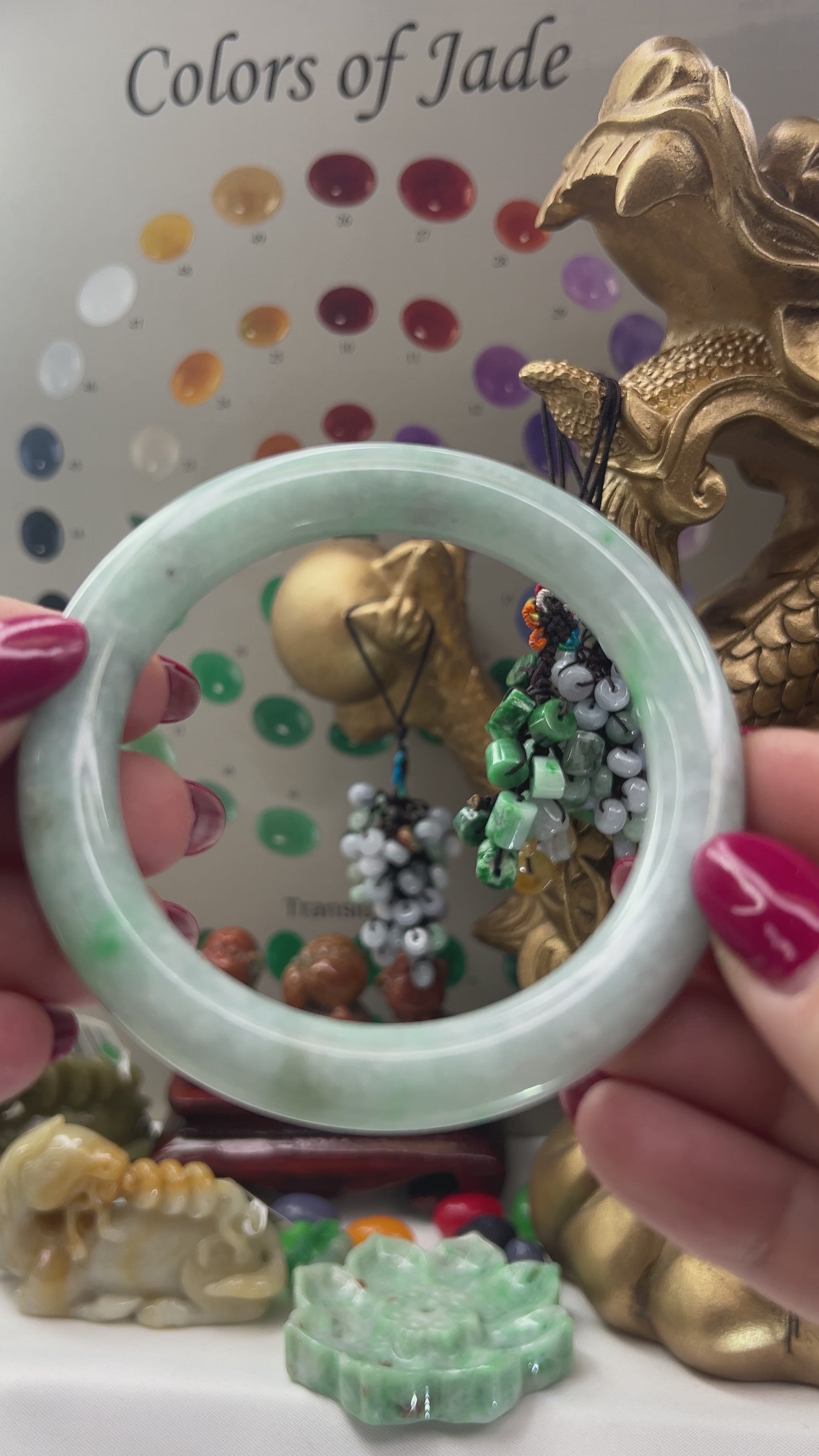 Discover the captivating blend light green with darker green spots in this jadeite jade bangle,
