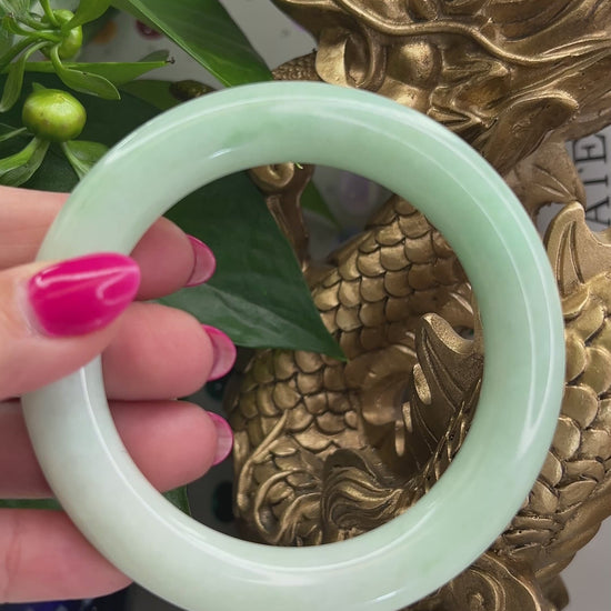 This natural jade bangle bracelet has natural green jade color. Our jadeite jade is natural, meaning it has NO dyes and NO polymer-impregnation. Some of our pieces may have a thin coating of beeswax to protect the surface of the jade. This does not affect the appearance or value of the stone.