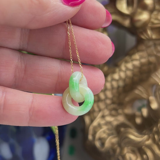 These two interlocking jadeite jade rings, carved from the same stone, feature a stunning combination of white with a vibrant apple green splash and a delicate hint of yellow, creating a truly unique and captivating piece.