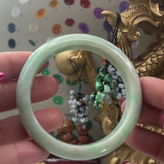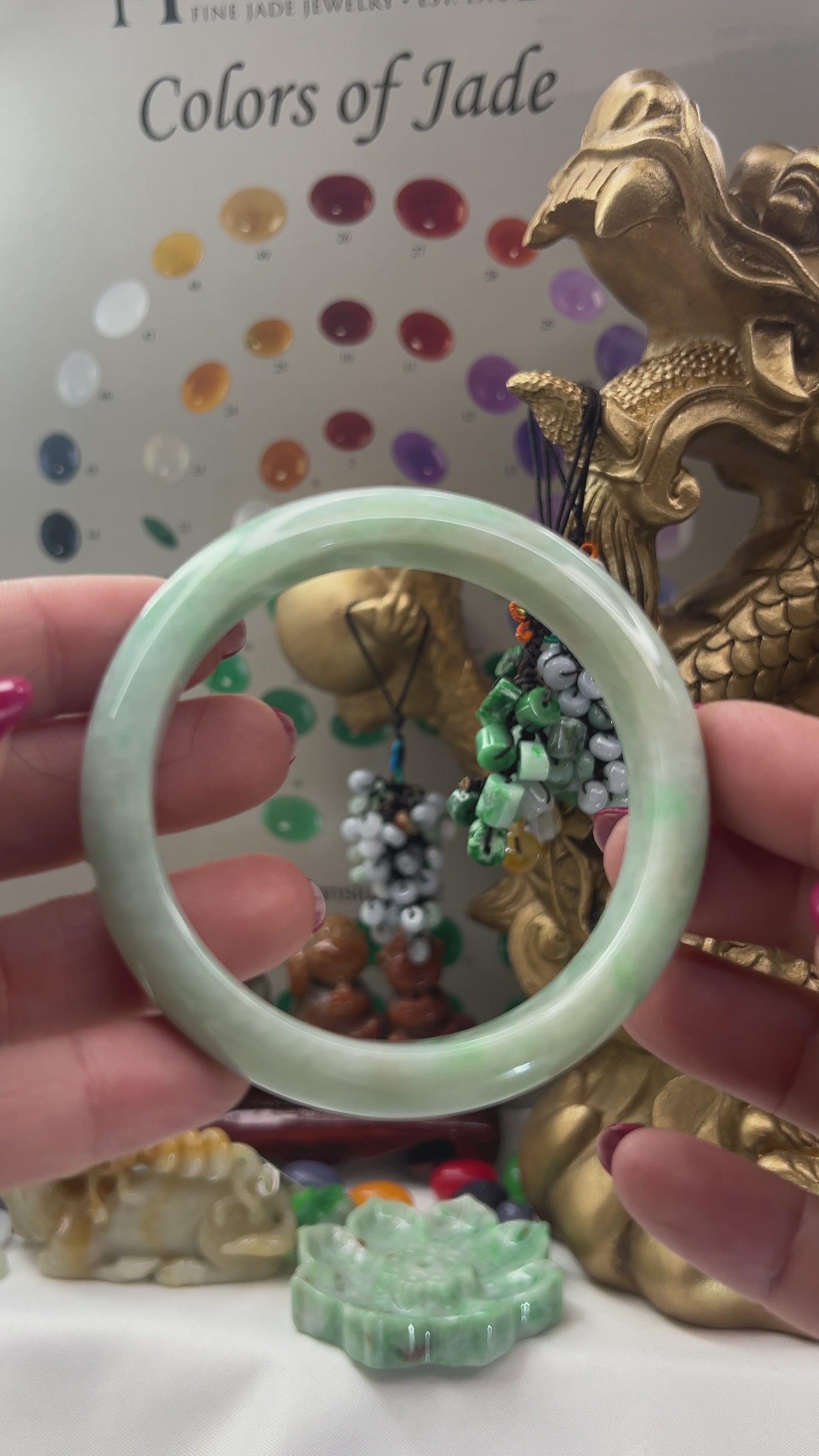 This natural jade bangle bracelet has natural light green jade color. Our jadeite jade is natural, meaning it has NO dyes and NO polymer-impregnation. Some of our pieces may have a thin coating of beeswax to protect the surface of the jade. This does not affect the appearance or value of the stone.
