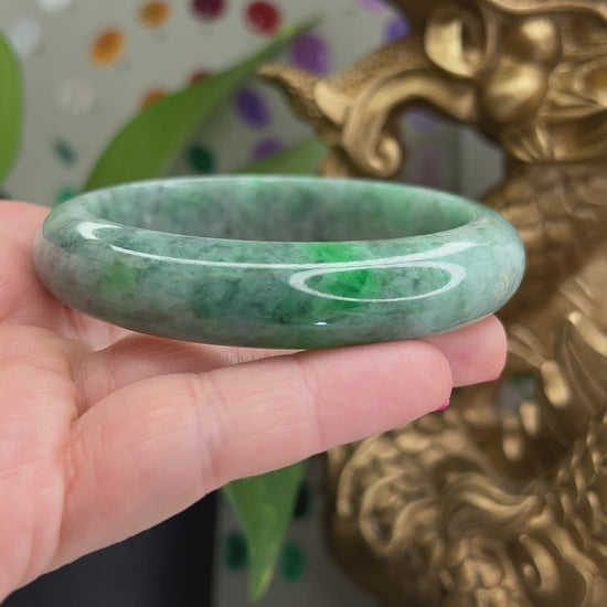 This natural jade bangle bracelet has natural green jade color. Our jadeite jade is natural, meaning it has NO dyes and NO polymer-impregnation. Some of our pieces may have a thin coating of beeswax to protect the surface of the jade. This does not affect the appearance or value of the stone.