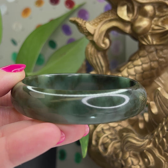 Moody and mysterious, this dark green jadeite jade bangle is accented by a delicate hint of red that adds depth and character.