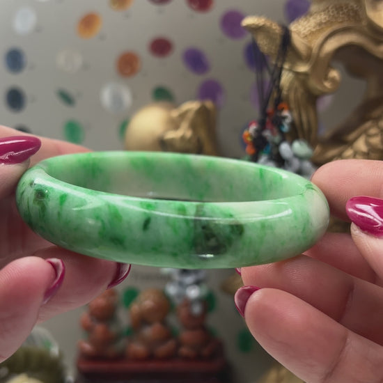 This natural jade bangle bracelet has natural green jade color. Our jadeite jade is natural, meaning it has NO dyes and NO polymer-impregnation. Some of our pieces may have a thin coating of beeswax to protect the surface of the jade. This does not affect the appearance or value of the stone.