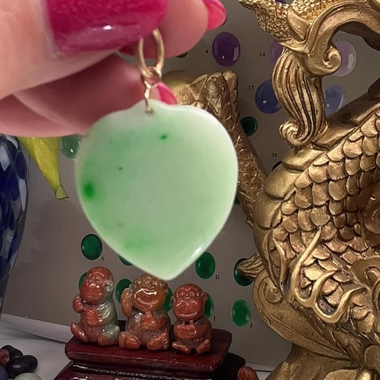 Green jadeite jade heart pendant on a 14k yellow gold satin-finished bail.