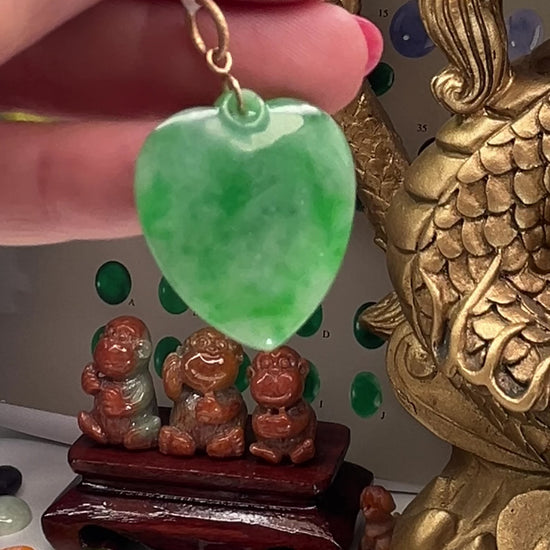 Green jadeite jade heart pendant on a 14k yellow gold satin-finished bail. This high-quality jade carving has vivid green color and is a part of our Classic Jade Collection.