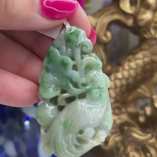 This exquisite loose carving showcases a green jadeite phoenix, embodying the sun and the feminine Yin energy, alongside Ling-Zhi mushrooms, symbols of longevity. Featuring deep green hues and intricate detailing on both sides, it’s a meaningful and beautiful piece.