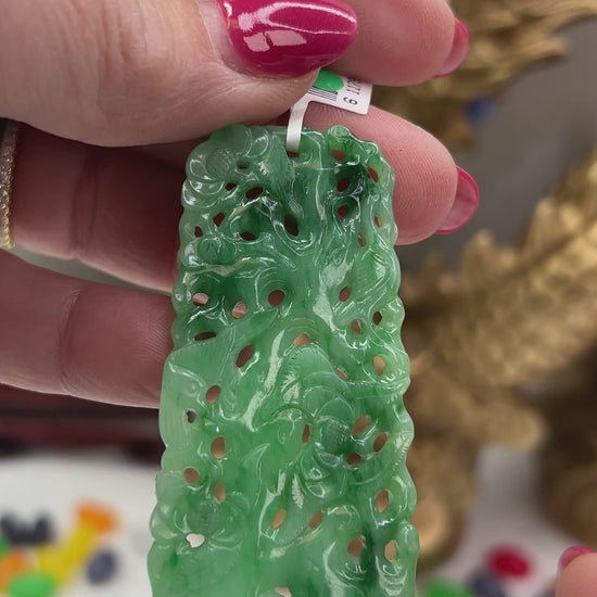 Natural fine green jadeite jade carving featuring a detailed carving of birds and the: