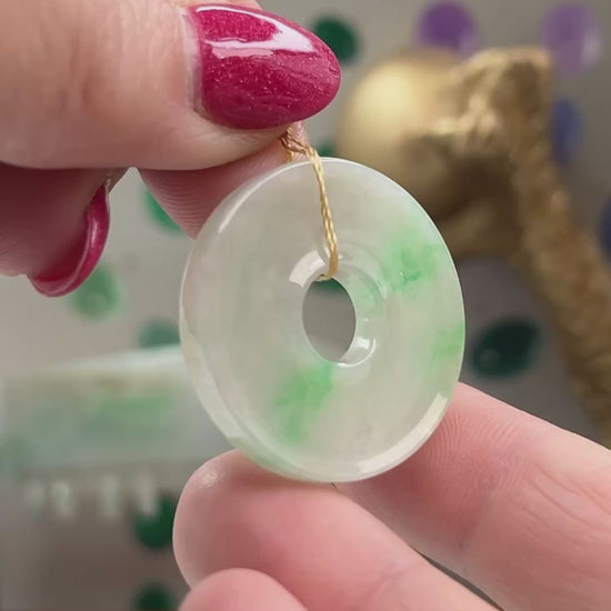 This green jadeite jade Pi disc (pronounced 'bee') has great soft green color and medium color splashes of green. This disc has raised edges. This jade disc for men and women can be worn on a variety of styles of chain or cord. This jade stone has natural translucent "water" green color.