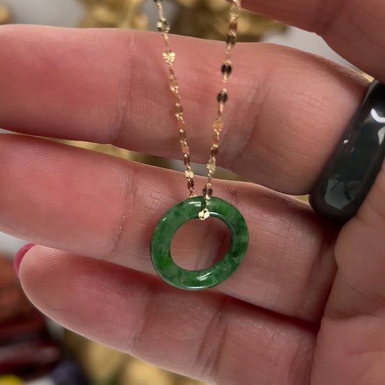 This stunning open circle pendant features deep shades of green jadeite jade, beautifully set on an adjustable at 18 and 16-inch 14K yellow gold chain for a striking and elegant look.