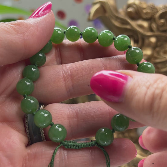 Elevate your style with this stunning adjustable pull-cord bracelet featuring nineteen carefully chosen green nephrite jade beads. Its flexible design fits small to medium wrists effortlessly.