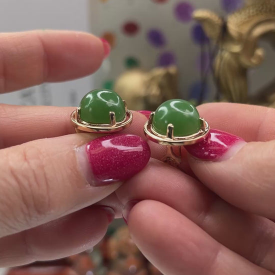Enhance your jewelry collection with these olive-green nephrite jade stud earrings. The round cabochons, set in a 14K yellow gold frame, showcase a truly beautiful color and ideal size. Shop Mason-Kay Jade for natural jade jewelry and elevate your style to new heights.