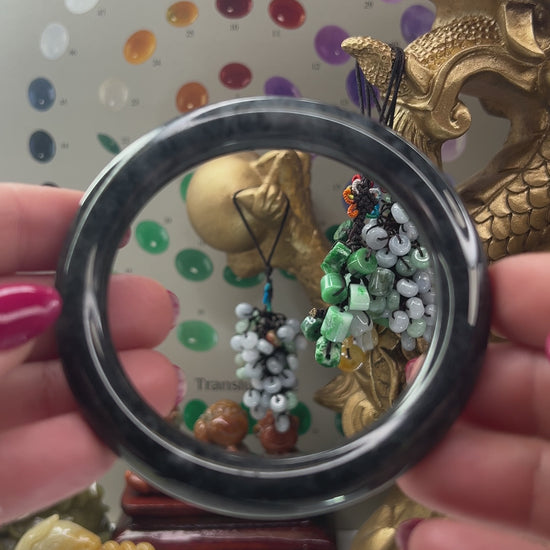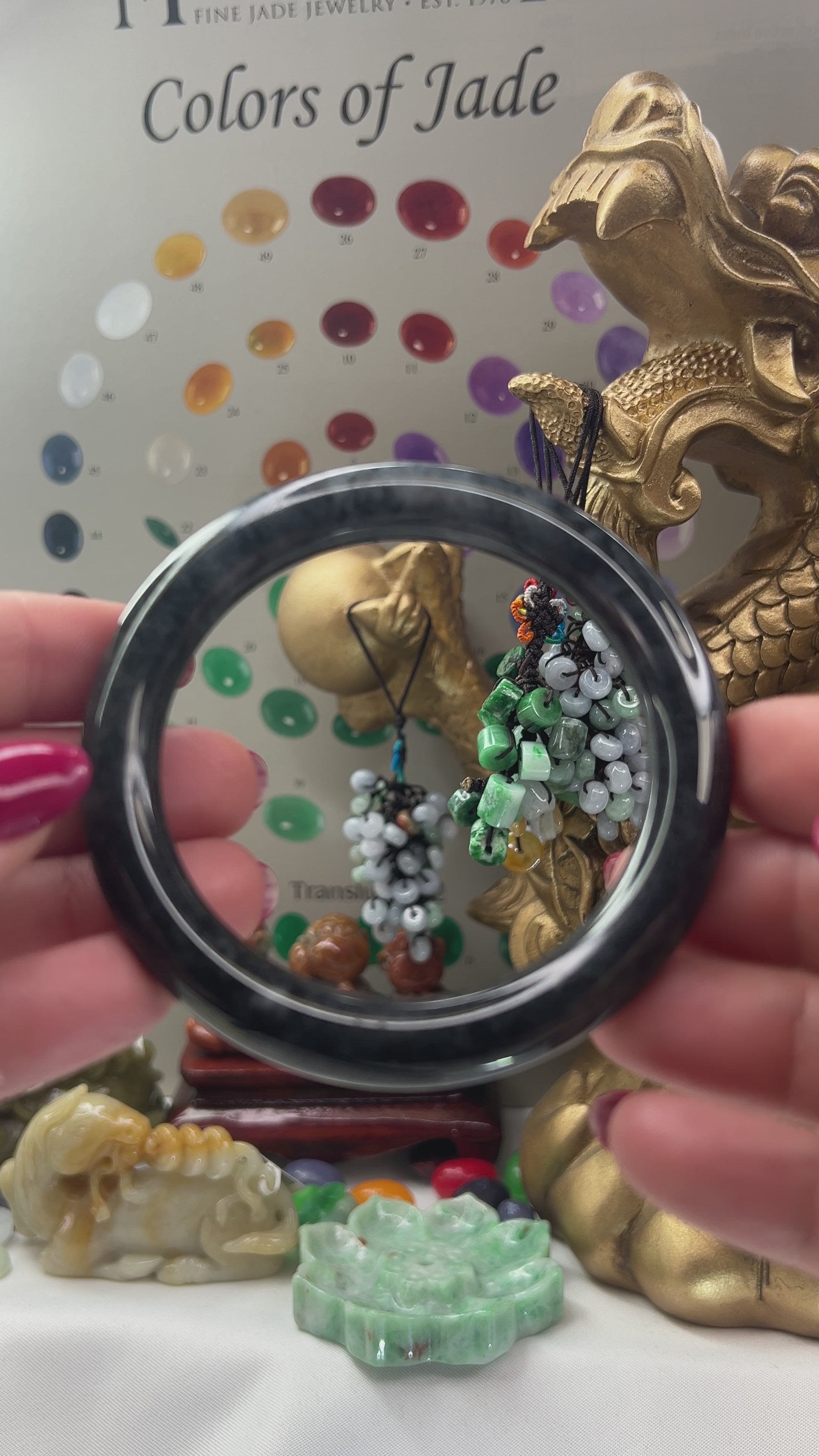 Experience perfect balance with this cylindrical dark grey jadeite bangle! Measuring 9.5mm thick and with an inside diameter of 57.6mm, it is a powerful symbol of harmony.