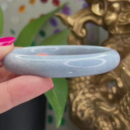 This natural jade bangle bracelet has natural lavender jade color. Our jadeite jade is natural, meaning it has NO dyes and NO polymer-impregnation. Some of our pieces may have a thin coating of beeswax to protect the surface of the jade. This does not affect the appearance or value of the stone.