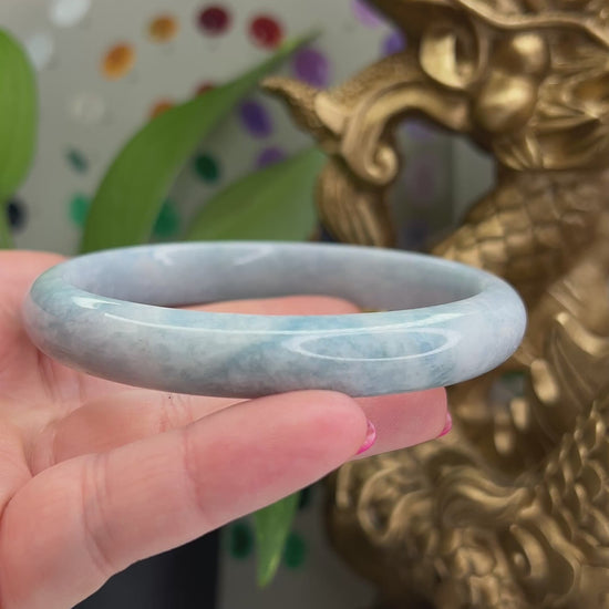 Discover the stunning Guatemalan lavender jadeite jade bangle, accentuated by unique bluish spots for a truly captivating look.