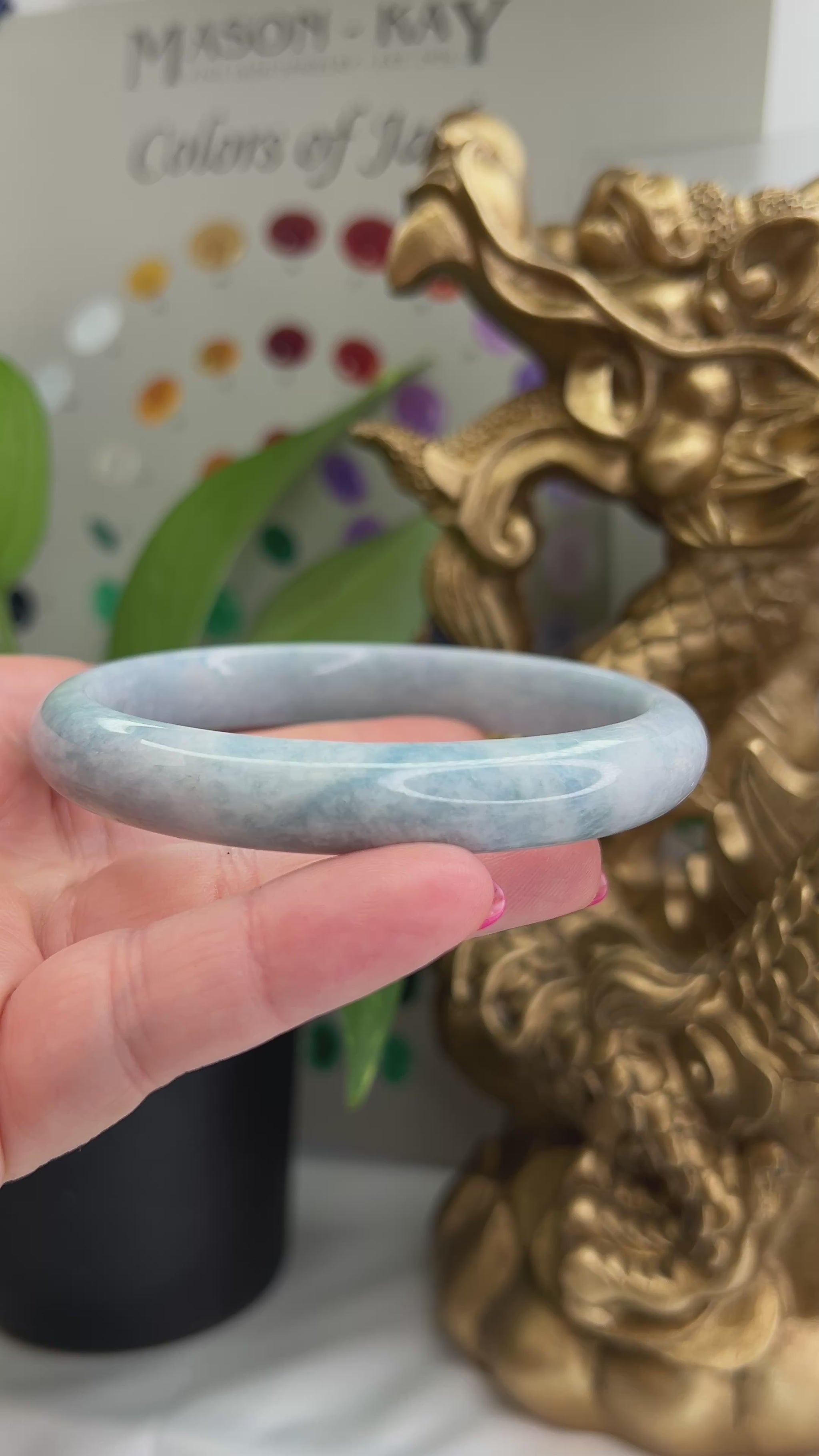 This natural jade bangle bracelet has natural lavender jade color. Our jadeite jade is natural, meaning it has NO dyes and NO polymer-impregnation. Some of our pieces may have a thin coating of beeswax to protect the surface of the jade. This does not affect the appearance or value of the stone.