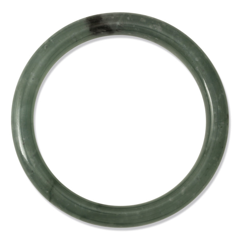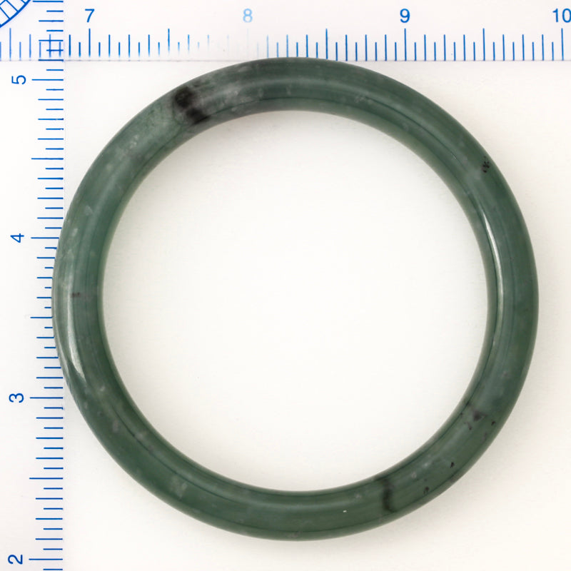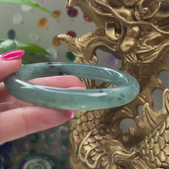 Discover the charm of this stunning blue-green Guatemalan jadeite jade bangle, adorned with a distinctive ice white specks and dark streaks throughout.