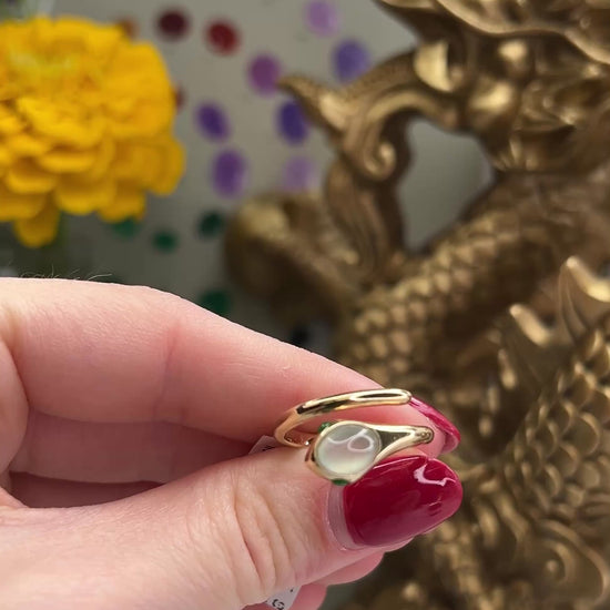 Ice jadeite jade snake head with green jade eyes in a 14K yellow gold bypass ring.