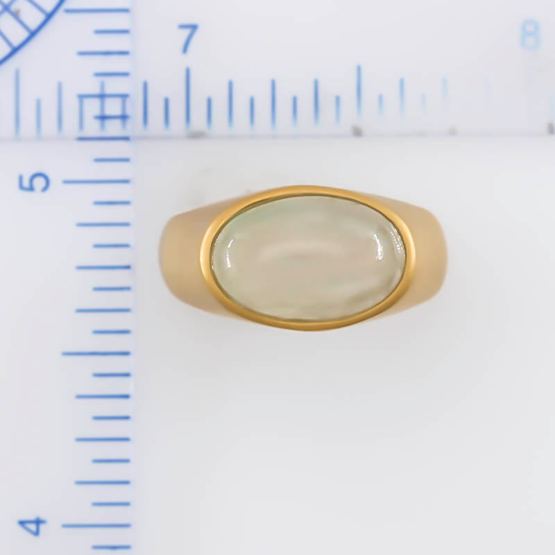 Stunning ice jadeite jade oval cabochon cross set set in an 18K yellow gold satin finished mounting. Incredible style and flare for any special occasion. Add this one-of-a-kind jade ring to your jewelry collection.