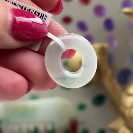 This ice jadeite jade Pi disc (pronounced 'bee') has great translucency and a green streak. This jade disc for men and women is perfect in size and color and can be worn on a variety of styles of chain or cord. This jade stone has natural translucent color.