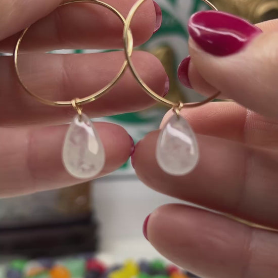 Translucent ice jadeite jade tear drop charm on a 14K yellow gold hoop earring. Shop natural jade jewelry from Mason-Kay Jade for your jade jewelry collection.