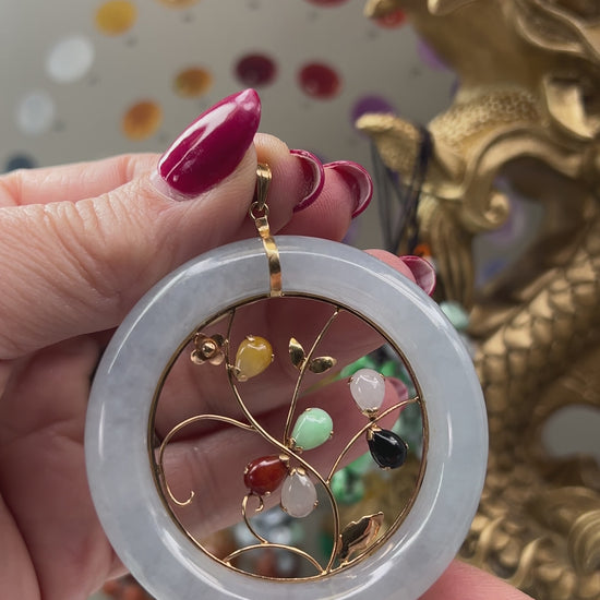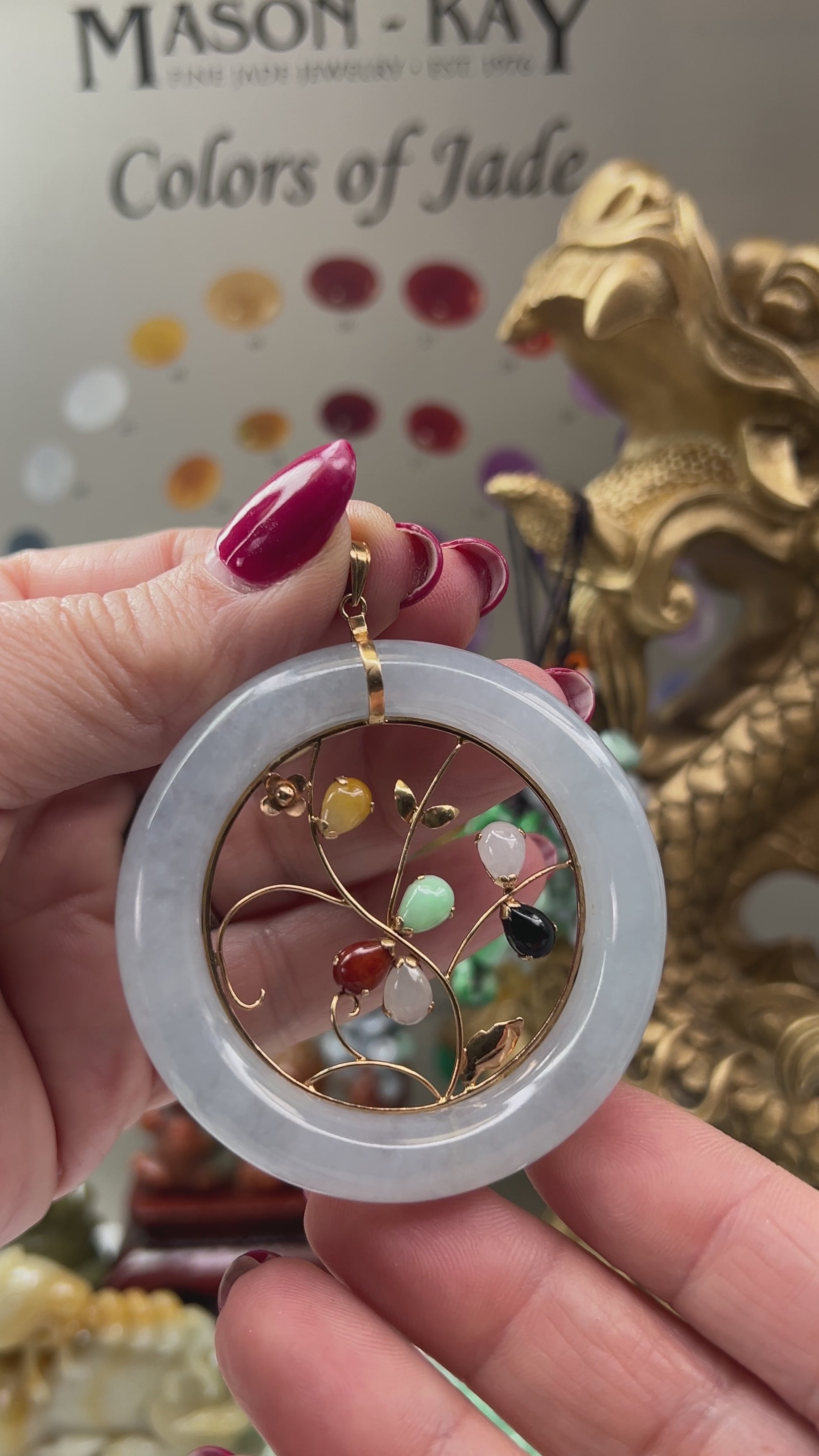 Elegant estate pendant combining a cool-toned ice jade open circle with colorful rainbow jade petals arranged in a gold blooming flower motif. Crafted in 14K yellow gold, this vintage piece captures timeless sophistication and natural jade artistry.