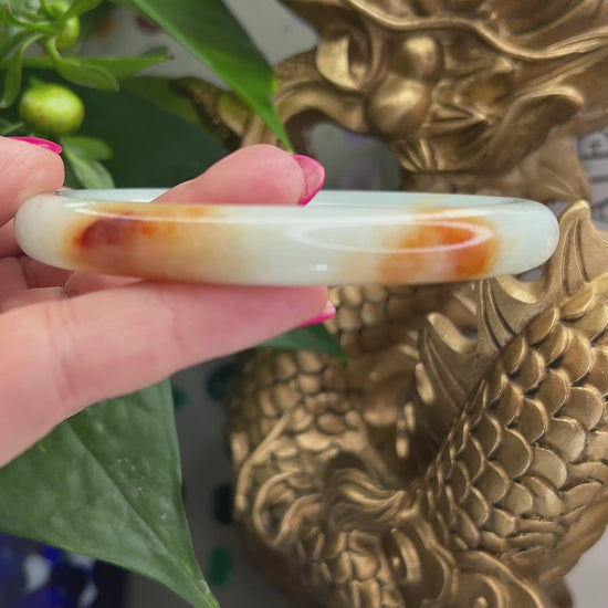 This natural jade bangle bracelet has natural green and red jade color. Our jadeite jade is natural, meaning it has NO dyes and NO polymer-impregnation. Some of our pieces may have a thin coating of beeswax to protect the surface of the jade. This does not affect the appearance or value of the stone.