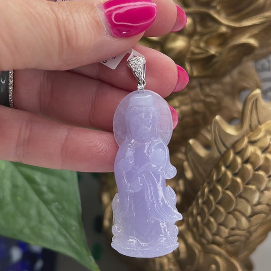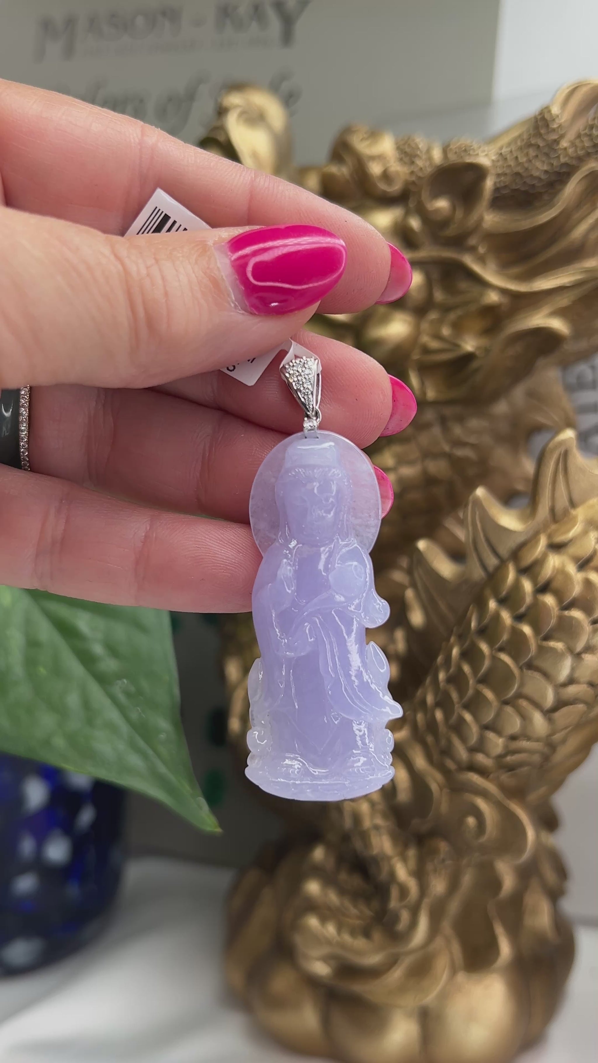 This beautiful vintage pendant highlights a delicately carved lavender jadeite jade Kwan Yin (Goddess of Mercy). It is elegantly paired with a white gold bail adorned with pave diamonds, presenting captivating color and expert craftsmanship that create a one-of-a-kind treasure.