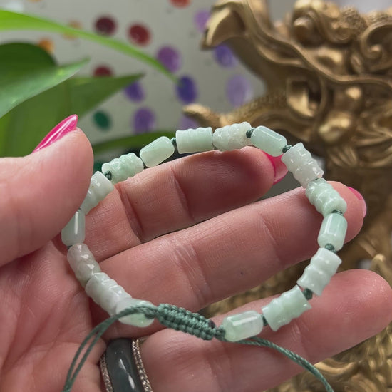 This stylish adjustable bracelet features sixteen ribbed and smooth tube beads crafted from gentle green jadeite jade. Its beautiful green tones offer a striking appearance, designed to comfortably fit small to medium wrists. An elegant jade piece ideal for gifting or adding a distinctive touch to your jewelry collection.