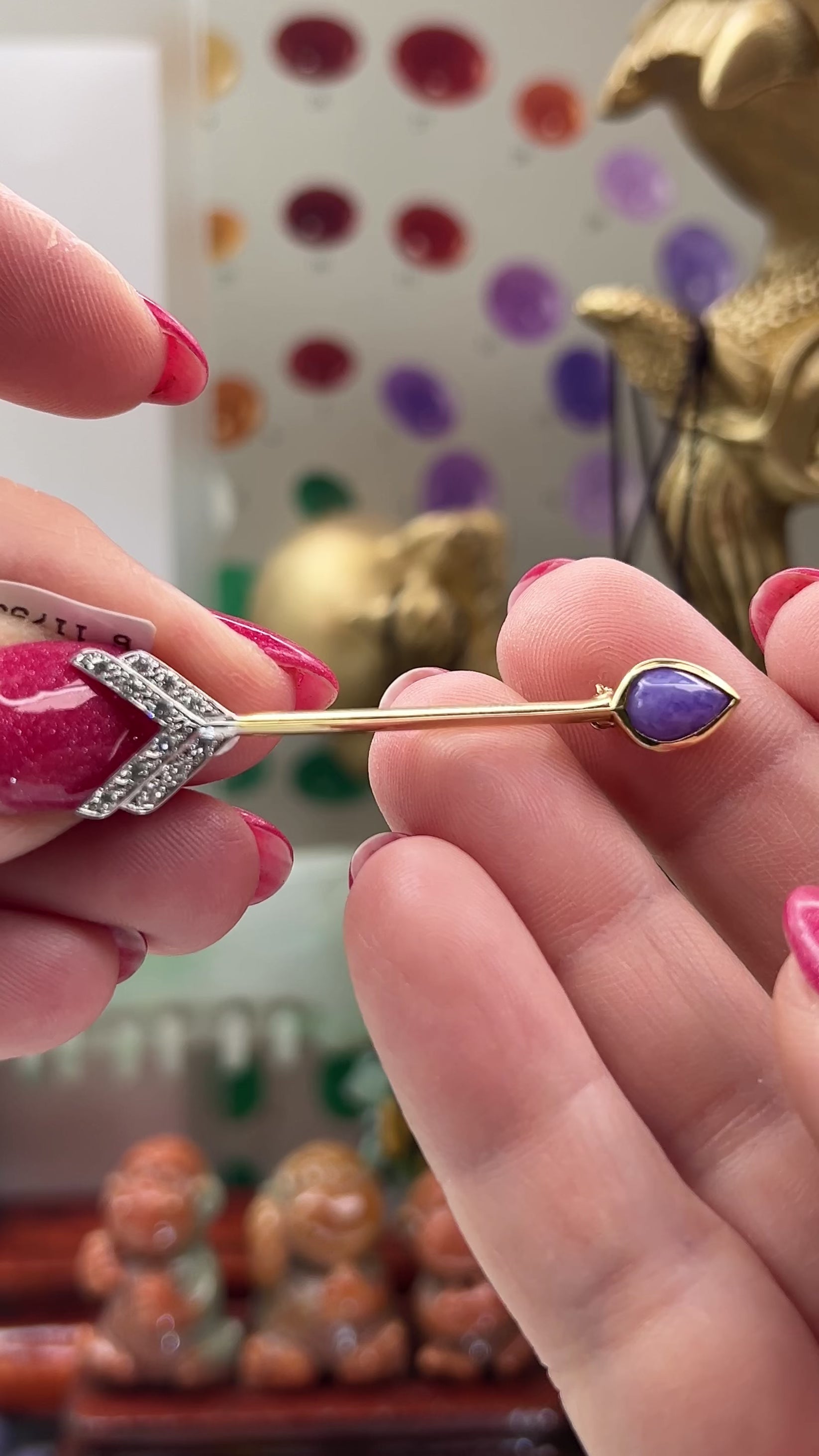 This striking arrow pin showcases a vibrant pear-shaped lavender jadeite jade complemented by a 0.20ct diamond accent, all elegantly set in 18k yellow gold. A refined piece that blends natural beauty with timeless craftsmanship.