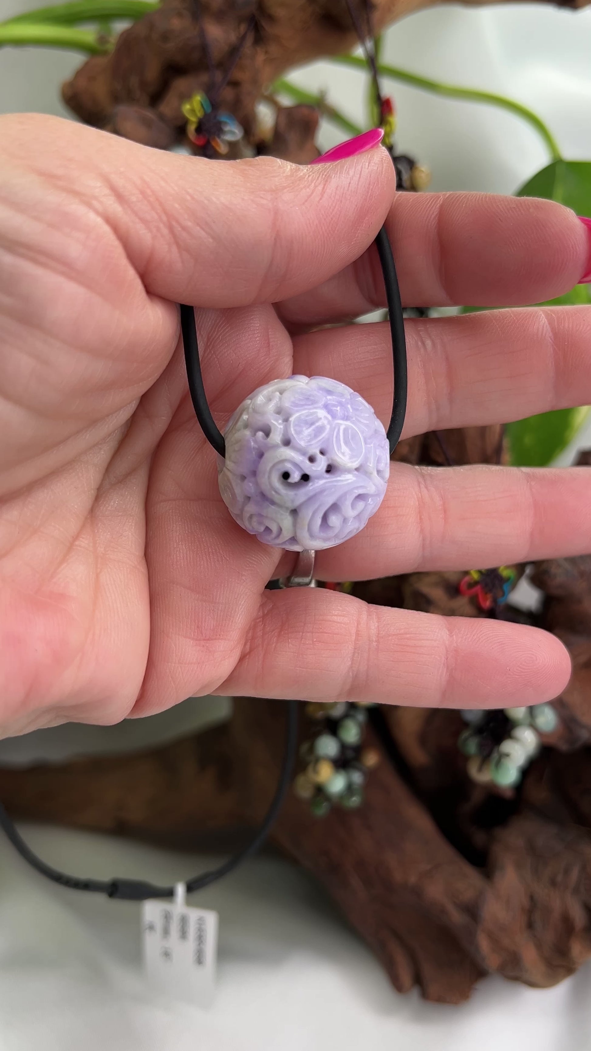 Purple jade necklace for women featuring a detailed jade carving, depicting a swirling organic motif. This large round bead can be worn on other chains and cords in your jewelry collection.