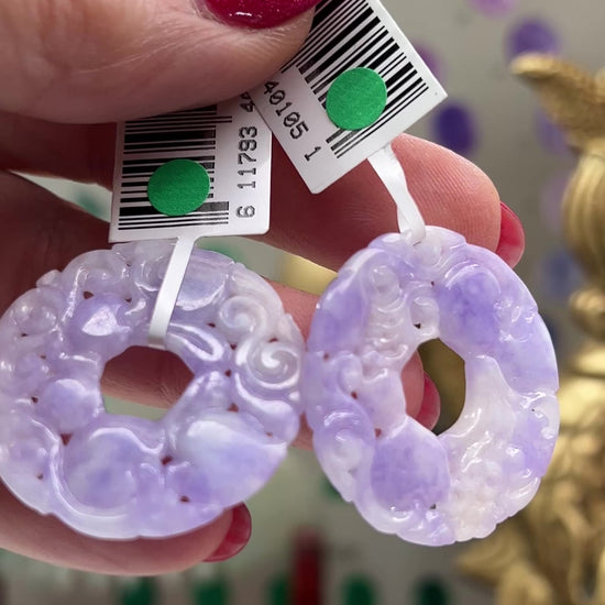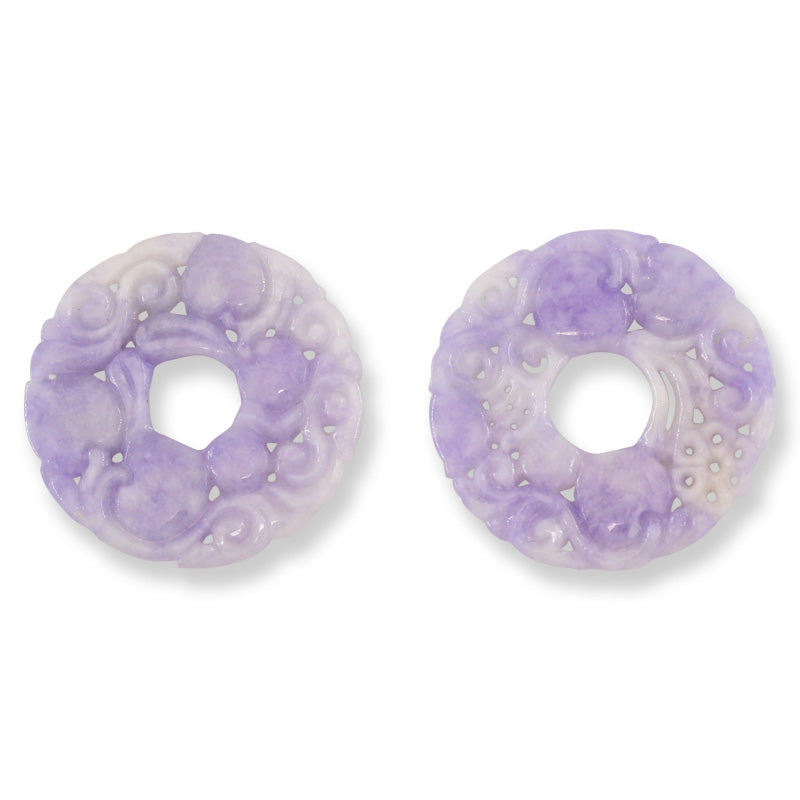 These carved lavender jadeite jade Pi discs (pronounced 'bee') have amazing coloring and would make a perfect pair for sharing. Carved with peaches and floral. This jade disc for women can be worn on a variety of styles of chain or cord. This jade stone has natural lavender color.
