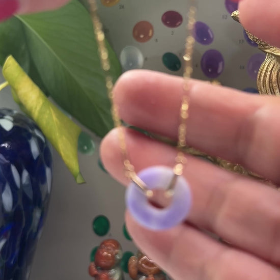 This stunning circle pendant features striking hues of lavender jadeite jade, beautifully set on an 18-inch adjustable at 16-inch 14K yellow gold chain for a striking and elegant look.