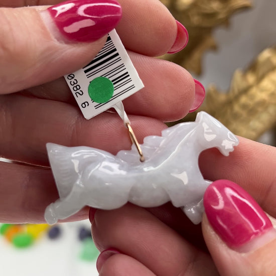Light lavender jadeite jade running horse pendant on a 14k yellow gold bail.
