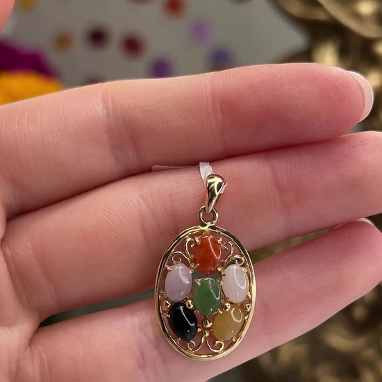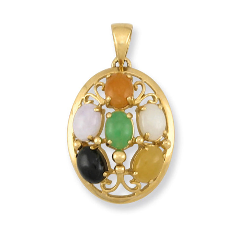 This pendant features six vivid rainbow jadeite jade ovals beautifully arranged within an elegant yellow gold scroll frame, finished with a sleek bail. Embrace the full spectrum of jade colors instead of settling for just one.