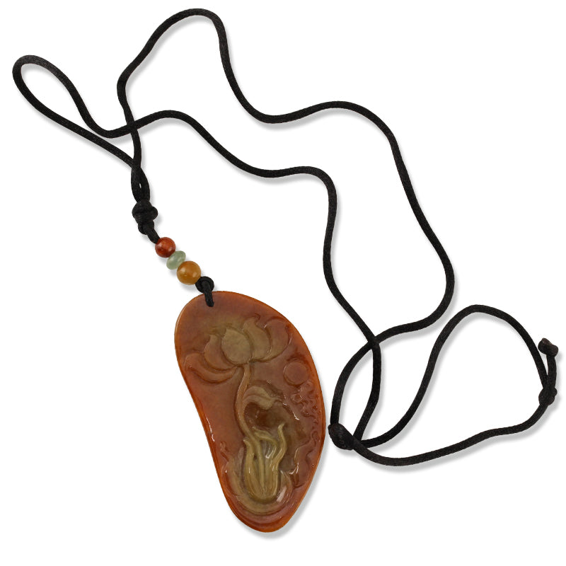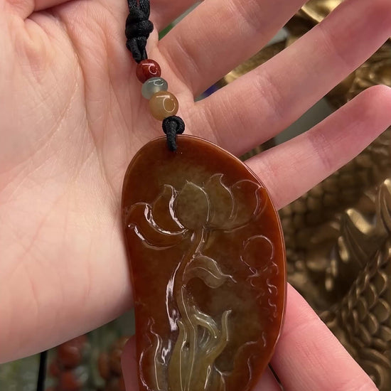 Large red jade carving on a adjustable silky cord with yellow, green and red jade bead accents. The lotus flower appears to be held by Kwan Yin (Goddess of Mercy).