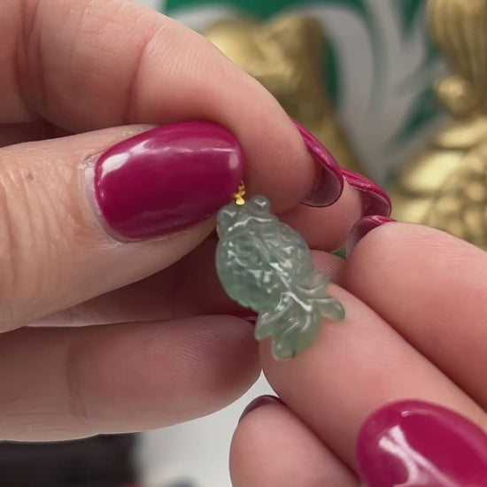 A striking vintage jadeite pendant featuring an intricately carved fish in luminous watery green. The piece showcases exceptional detail throughout the carving, complemented by an antiqued lattice bail that enhances its timeless appeal.