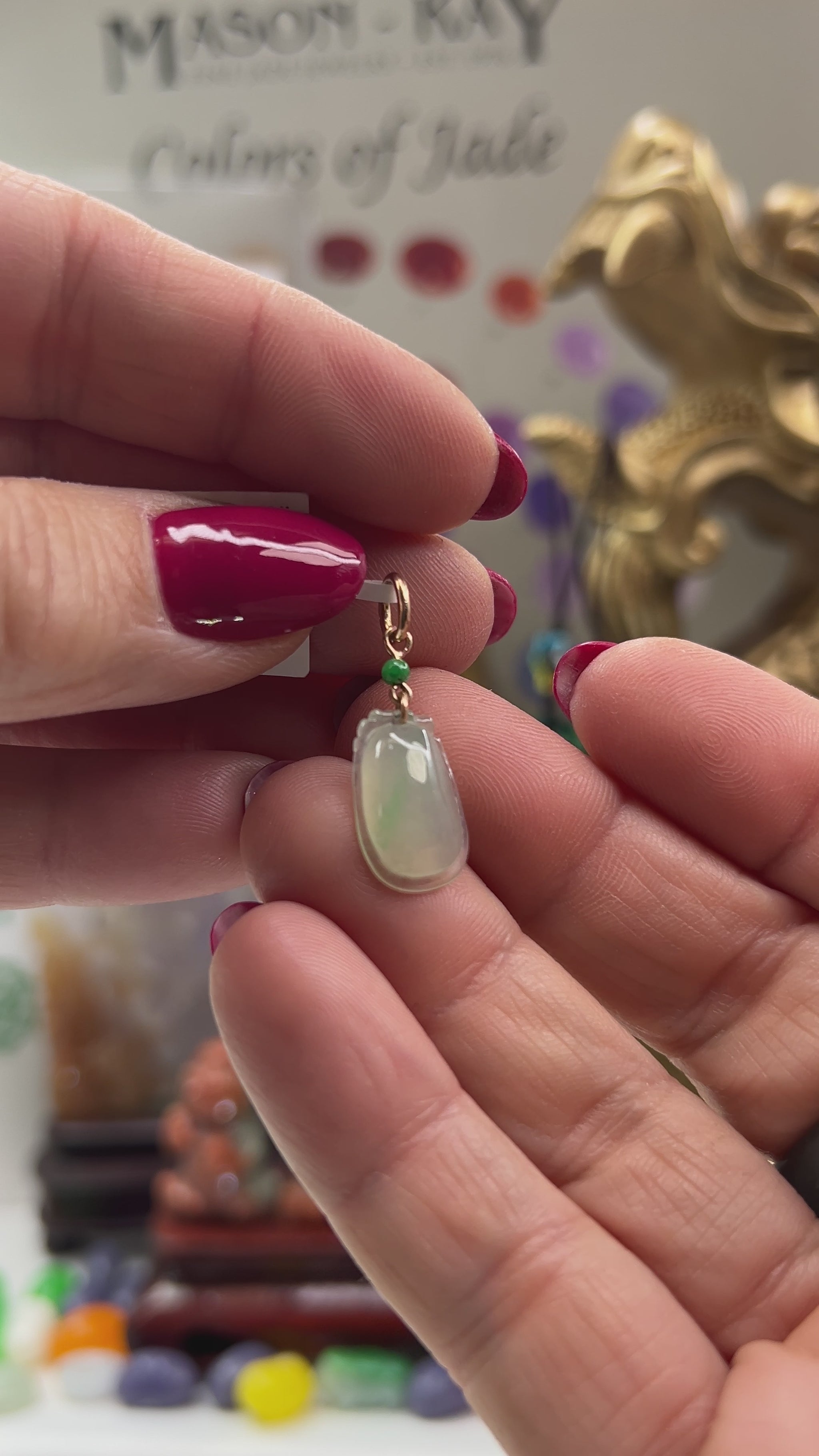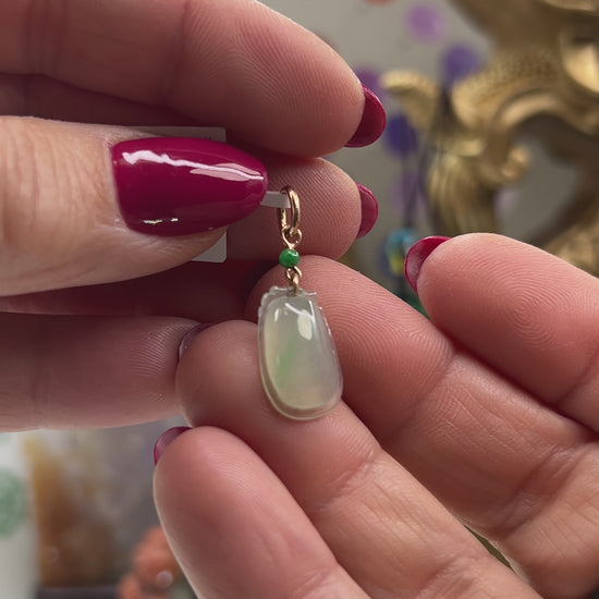 Carved from watery green jadeite jade, this jade gourd carving is accented by a bright green jade bead and a 14K yellow gold bail.