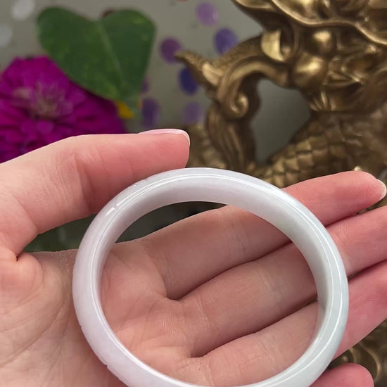 This natural jade bangle bracelet has natural lavender jade color. Our jadeite jade is natural, meaning it has NO dyes and NO polymer-impregnation. Some of our pieces may have a thin coating of beeswax to protect the surface of the jade. This does not affect the appearance or value of the stone.
