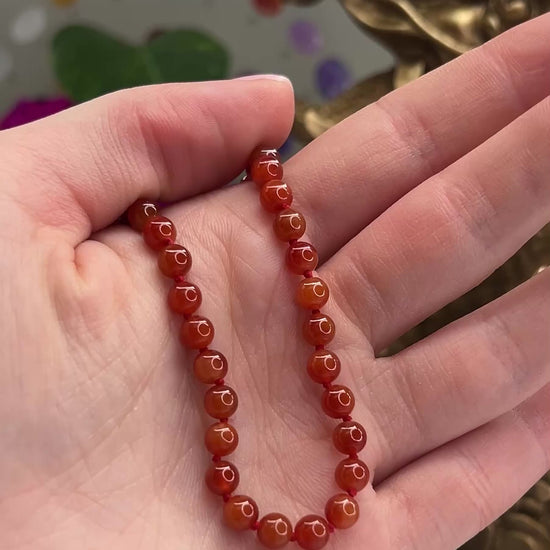 This exquisite necklace features 86 hand-knotted, 5mm beads of natural red translucent fine jadeite jade, measuring 18 inches in length. It is secured with a distinctive 14K yellow gold "MK" box clasp. Red jade symbolizes fire, embodying power, celebration, and good fortune. With its striking deep hue, this unique jade necklace is a rare treasure that stands out beautifully.