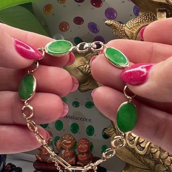 Discover timeless sophistication with this vintage-inspired jadeite bracelet. Four apple green jadeite jade ovals nestle in 14K yellow gold settings, accented by hand-etched details across two connecting links. At a comfortable 7 inches, this refined piece celebrates natural stone beauty and masterful craftsmanship—an effortless addition to any jewelry collection.
